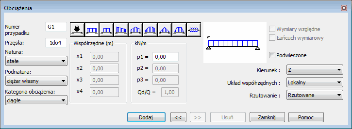W przypadku obciążenia ciągłego w polu Współrzędne znajdują się opcje: x1, x2, x3 i x4 oraz p1, p2, p3.