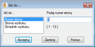 W panelu znajdującym się w lewej części okna dialogowego należy wybrać jedną z trzech opcji: numer strony, stronę wydruku i składniki wydruku. W polu znajdującym się w prawej części okna należy podać odpowiedni numer strony lub wybrać nazwę odpowiedniego składnika z listy składników znajdujących się w zdefiniowanym wydruku.