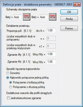 W powyższym oknie dialogowym określone mogą zostać dodatkowe parametry pręta dla normy chińskiej GB50017 - 2003. Jest dostępna po naciśnięciu przycisku Więcej znajdującego się w oknie dialogowym Definicja pręta — parametry.
