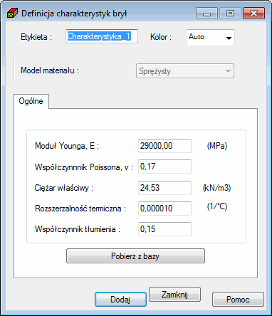 Naciśnięcie przycisku Pobierz z bazy powoduje otwarcie dodatkowego okna dialogowego, w którym wybrany może zostać materiał dostępny w bazach materiałowych. Po wybraniu takiego materiału parametry są wpisywane w odpowiednie pola w oknie dialogowym Definicja charakterystyk brył.