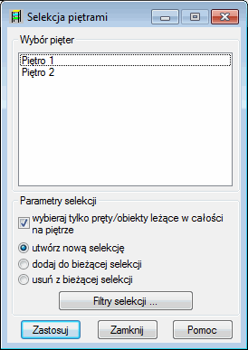 W dolnej części okna dialogowego określone mogą zostać parametry selekcji piętrami konstrukcji: