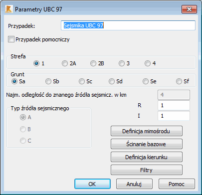 Parametry analizy sejsmicznej konstrukcji zależą od wyboru normy sejsmicznej, która będzie wykorzystywana podczas obliczeń konstrukcji poddanej wpływom obciążeń sejsmicznych. Po wyborze amerykańskiej normy sejsmicznej UBC 97 ("The Uniform Building Code 1997") w oknie dialogowym Nowy przypadek lub naciśnięciu klawisza Parametry w oknie Typ analizy na ekranie pojawia się okno dialogowe pokazane poniżej.