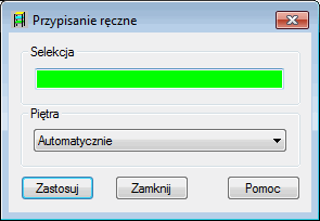 Opcja pozwala na przypisanie elementów konstrukcji do zdefiniowanych pięter (jest to ważne podczas weryfikacji konstrukcji). Opcja jest dostępna z menu poprzez wybranie opcji Geometria / Piętra / Przypisanie ręczne.