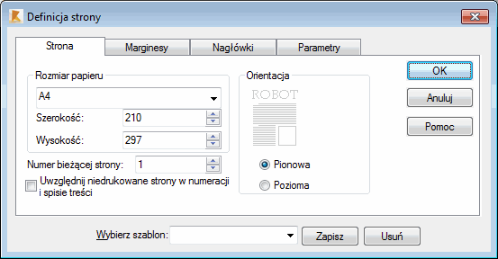 W powyższym oknie dialogowym użytkownik ma możliwość zdefiniowania następujących parametrów: rozmiar papieru, orientacji i numeru bieżącej strony.