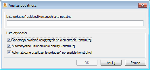 Po otwarciu okna dialogowego Analiza podatności w polu edycyjnym Lista połączeń zakwalifikowanych jako podatne znajdować się będzie grupa połączeń, którym podczas obliczeń połączeń został przyporządkowany typ połączenia pół—sztywne.