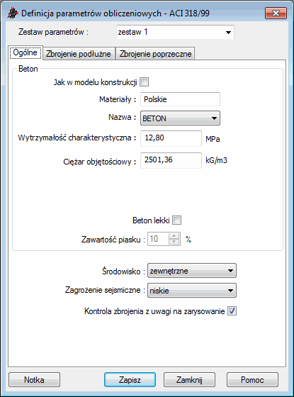 Uwaga: Zgrupowane zostały parametry potrzebne do wymiarowania elementów żelbetowych, które nie są związane z ich geometrią, takie jak: właściwości stali i betonu, typy użytych prętów, otuliny itp. Pozostałe parametry normowe, zależne od geometrii, definiowane są w oknie
