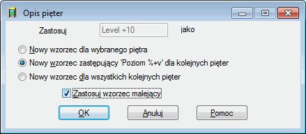 - Nowy styl etykiety dla wszystkich kolejnych pięter — Nazwa wybranego piętra będzie traktowana jako wzorzec dla później definiowanych pięter. Nazwy wszystkich kolejnych kondygnacji są zmieniane.
