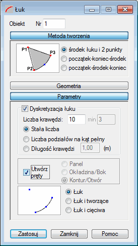 W części okna dialogowego nazwanej Parametry znajdują się dodatkowe opcje umożliwiające określenie parametrów dyskretyzacji tworzonego łuku.
