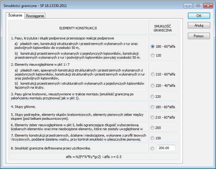 Na karcie Ściskanie znajduje się zestaw elementów konstrukcji, dla których wartości graniczne smukłości elementu poddanego ściskaniu są definiowane przez normę w tabeli 32. W przypadku łącznie z alfa współczynnik jest wybrana, wówczas program definiuje ograniczenie smukłości automatycznie podczas obliczeń i porównuje go do rzeczywistych smukłości obliczane dla analizy.
