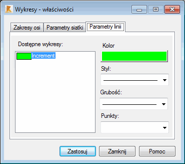Opcje znajdujące się w tym oknie dialogowym pozwalają na określenie parametrów linii, która przedstawiać będzie zdefiniowane wykresy. W panelu Dostępne wykresy przedstawiane są wszystkie wykresy wielkości, które są odkładane na osi Y. Dla każdego wykresu dostępne są następujące opcje: