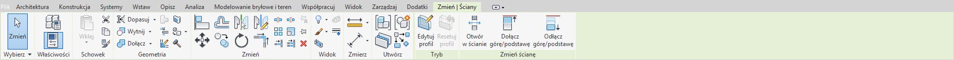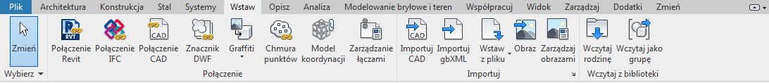 Wstążka jest wyświetlana podczas tworzenia lub otwierania pliku. Zawiera ona wszystkie narzędzia potrzebne do utworzenia projektu lub rodziny.