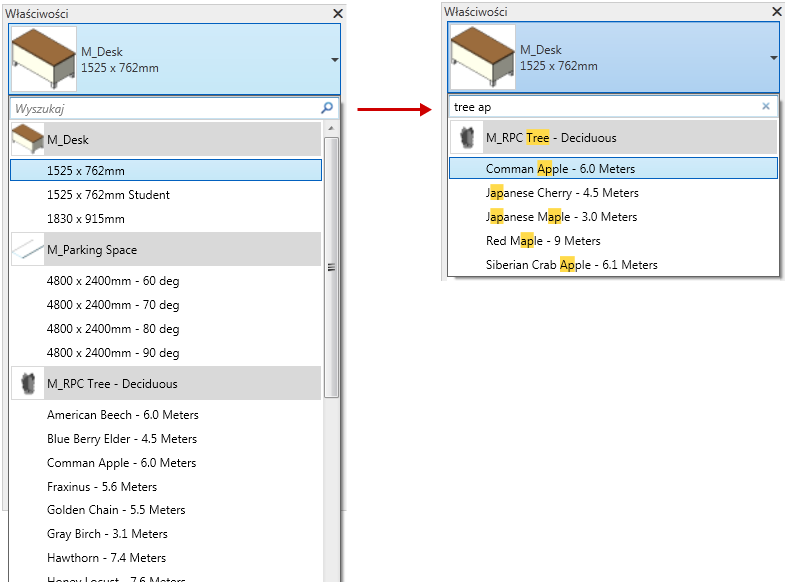 Revit udostępniono funkcję wyszukiwania, aby ułatwić wybór z długiej listy opcji. Można wyszukiwać w następujących obszarach funkcyjnych: