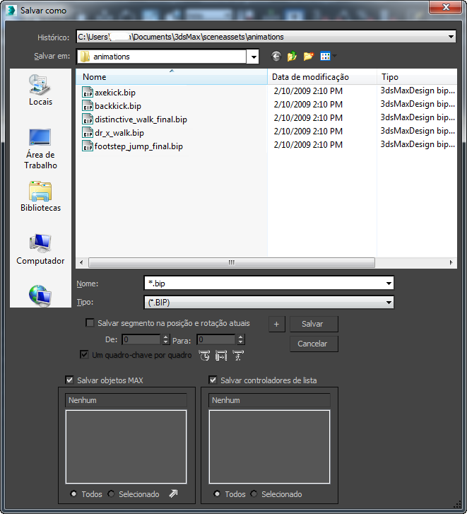 - Quando ativado, qualquer controlador de animação atribuído ao bípede será salvo com o arquivo BIP.