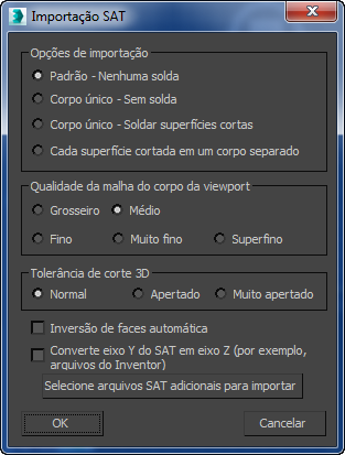 Nota: Os arquivos SAT podem ser muito grandes em tamanho. Se tiver problemas ao importar um arquivo SAT, definir a exibição para uma única viewport de estrutura de arame antes de importar e defina a qualidade da malha de corpo de viewport como de baixa resolução. Também, para importar arquivos SAT maiores que 100 MB, recomenda-se utilizar a versão de 64 bits do 3ds Max.