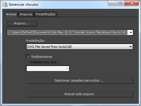 Exibe uma lista de configurações predefinidas que é possível selecionar para usar ao anexar o arquivo. Cada entrada da lista nesta lista representa uma única coleção de anexar e recarregar as configurações. É possível criar predefinições adicionais no painel Predefinições da caixa de diálogo Gerenciar vínculos.