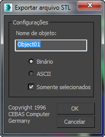 Escolher se o arquivo de saída STL terá dados binários ou ASCII (caractere). Os arquivos STL ASCII são muito maiores do que os arquivos STL binários.