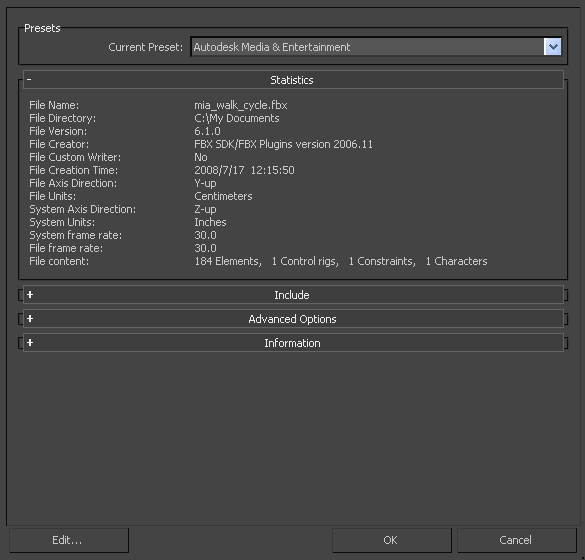 Esta seção descreve como importar arquivos usando o plug-in FBX do 3ds Max:
