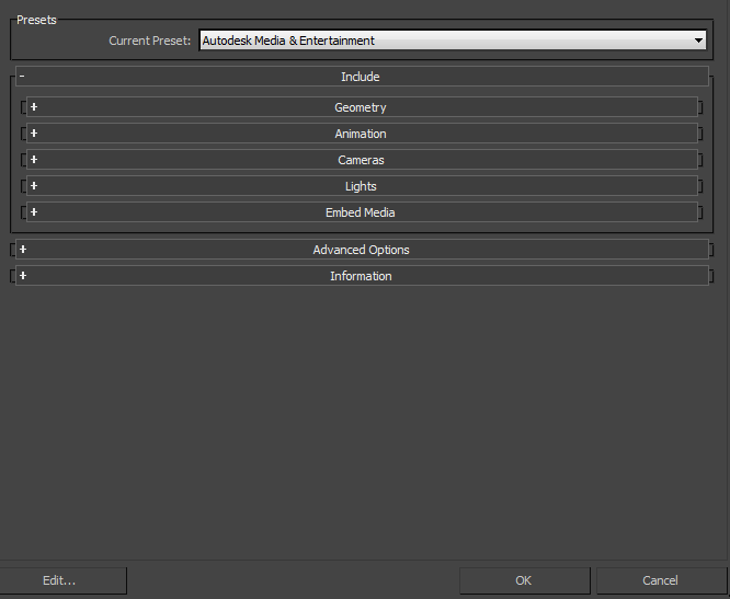 Autodesk Media and Entertainment é a predefinição padrão do Exportador do 3ds Max