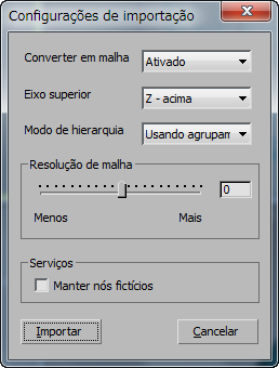 - Define a resolução de objetos quando você os importa como objetos de Malha editável. Valores maiores resultam em objetos mais detalhados, que podem ser mais caros em termos de tempo e armazenamento. Valores menores resultam em objetos menos detalhados. Intervalo = –10 a 10. Padrão=0.