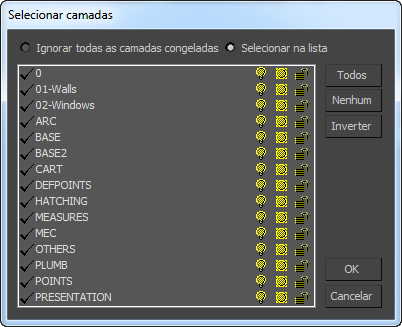 Essa caixa de diálogo permite alternar entre o status incluir/excluir da camada de um arquivo DWG e selecionar outras opções, como descrito neste tópico.