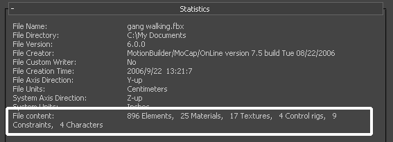 A janela de estatísticas permite a exibição de informação sobre os metadados relevantes das configurações do arquivo de entrada (FBX) e do sistema (aplicativo). As informações variam dependendo do que está no arquivo.