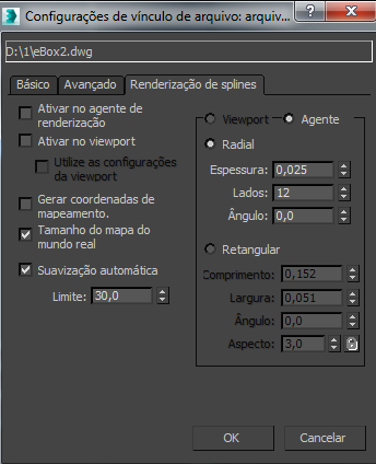 O painel de Renderização da spline da caixa de diálogo Opções de importação lhe permite determinar como objetos spline importados de arquivos DWG e DXF são exibidos nas viewports e como são tratados pelo renderizador do 3ds Max.