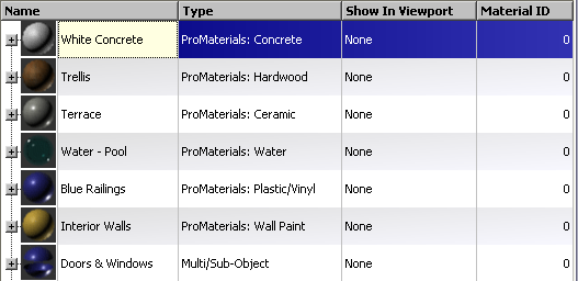 A janela principal do painel superior Cena do Material Explorer pode conter várias colunas com informações sobre os materiais da cena. Alguns tipos de colunas contêm células editáveis.