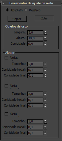 Utilize as caixas de seleção para alternar as aletas nos respectivos lados dos ossos e as configurações numéricas para controlar a configuração do tamanho e da conicidade das aletas.