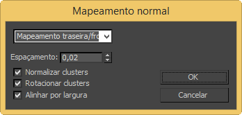 O método Mapeamento normal de mapeamento de procedimento aplica mapas planos com base em diferentes métodos de projeção de vetor aos polígonos de textura. Este é o método mais simples, mas pode resultar em distorção da textura ainda maior do que com a caixa de diálogo Aplainar mapeamento. A caixa de diálogo Mapeamento normal permite controlar como os clusters são definidos e mapeados.