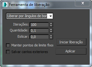 A caixa de diálogo fornece três métodos diferentes para liberação de vértices, além de diversos parâmetros numéricos e duas caixas de seleção. Você pode utilizar a opção Liberar para separar vértices de textura que estão muito juntos para texturizar com facilidade e para resolver as áreas sobrepostas.