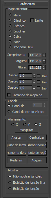 Define o canal de mapa. O modificador do Mapa de UVW é padronizado para 1, de forma que o mapeamento se comporte do modo padrão, a não ser que você altere explicitamente para outro canal. Padrão=1. Intervalo=1 a 99