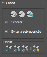 Inicialmente, as ferramentas de Casca estão disponíveis somente quando o nível de subobjeto Polígono está ativo e polígonos de textura são selecionados. A operação de casca escolhida se aplica somente aos polígonos selecionados. No entanto, quando o Modo de casca está ativo, o botão Modo de casca permanece ativo e disponível em qualquer nível de subobjetos ativado. É possível selecionar diferentes subobjetos ao utilizar o Modo de casca, mas somente as coordenadas de textura que pertencem aos polígonos que foram selecionados quando você ativou pela primeira vez o Modo de casca estão sujeitas às ações de casca. Para descascar diferentes polígonos, desative o Modo de casca, faça outra seleção e reative o Modo de casca.