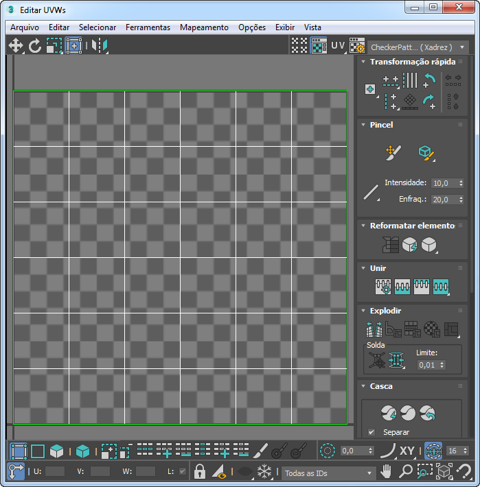 A janela da vista exibe os UVWs no espaço de imagem 2D do mapa, sobrepostos sobre uma grade. Linhas de grade mais grossas mostram os limites de um mapa de textura como apareceriam no espaço de imagem. O canto inferior esquerdo do retângulo possui as coordenadas (0,0) e o canto superior direito possui as coordenadas (1,1).