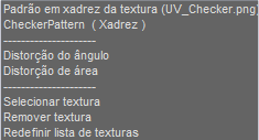 O Verificador de textura (UV-Checker.png) é útil para identificar a direção de UV e a direção normal. Este bitmap pode ser substituído em \\maps\uvwunwrap.