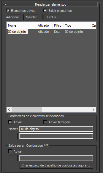 Nota: É necessário adicionar ao menos um elemento de renderização para este arquivo ser criado e o tipo Renderizar saída no painel Comum deve ser definido como AVI, RPF, CIN, JPG, PNG, MOV, RGB, RLA, TGA, TIF ou EXR.