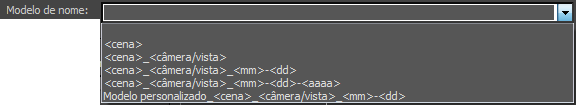 O campo de texto permite criar novos modelos. Por exemplo, você pode alterar <cena>_ <dd>_<mm> para <dd>_<mm>_<cena>. Qualquer texto que você inserir se tornará parte do modelo de nome. O 3ds Max pode salvar até 10 modelos personalizados (não contando os que são padrão, que sempre aparecem na lista). Quando o número máximo de modelos personalizados for salvo, inserir um novo modelo faz com que o primeiro modelo personalizado salvo saia da lista.
