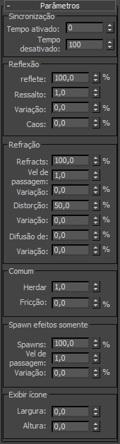 Nota: O valor Refrata apenas afeta as partículas que ainda não foram refletidas, pois as partículas refletidas são processadas antes das partículas refratadas. Portanto, se você definir Reflete a 50% e Refrata a 50%, você não obterá uma divisão 50/50 das partículas. Em vez disso, metade das partículas seria refletida e