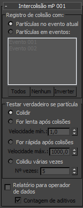 - Quando esta primeira opção estiver definida como Partículas no evento atual, o teste verificará colisões no evento em que reside o teste InterCollision do mParticles. Em alguns casos, as partículas no evento atuais podem colidir com as partículas próximas depois que essas já tiverem se movido para outro evento; se esta opção estiver ativa, tais colisões não serão registradas.