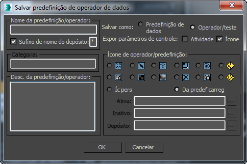Utilize esta caixa de diálogo para salvar seu operador de dados ou testar uma predefinição ou operador; no segundo caso, ela aparece no depósito Exibição de partículas após você sair e reiniciar o 3ds Max.