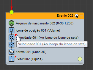 Se o cursor está sobre uma lista e você copiou as ações, as ações são adicionadas ao evento. Se o cursor está sobre uma área vazia da exibição de fluxo de evento de partículas cria um novo evento que contendo as ações coladas. Um evento copiado pode ser colado apenas em uma área vazia da tela evento.