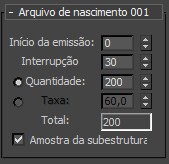 Para determinar o número de partículas emitidas por quadro quando utilizando o Quantidade, divida o valor do Quantidade pelo número de quadros de emissão (Parar Emissão-Iniciar Emissão + 1).