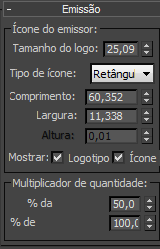 Define as características físicas do ícone do emissor (origem de partículas) e a porcentagem de partículas produzidas em viewports e na renderização.