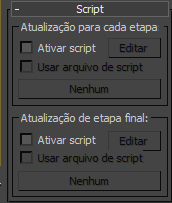 Quando Usar arquivo de script estiver desativado, este será o script padrão de Atualizar a cada etapa (3dsmax\scripts\particleflow\example-finalstepupdate.ms). Quando Usar arquivo de script estiver ativado, este será o script carregado, se você tiver carregado um. Se você ainda não carregou nenhum, clique em Editar para exibir a caixa de diálogo Abrir.