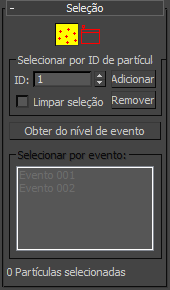 Use estes controles para selecionar partículas individualmente ou de acordo com eventos. A seleção de partículas no Nível de evento serve para fins de depuração e rastreamento. As partículas selecionadas no Sistema de partículas podem ser afetadas pelo operador de exclusão, pelo operador de seleção de grupo e pelo teste Dividir selecionado. Não é possível manipular diretamente as partículas selecionadas com ferramentas padrão do 3ds Max, como Mover e Rotacionar.