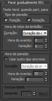 - A hora em que cada partícula deve parar. Na hora especificada, a partícula para de movimentar-se e/ou de girar completamente e é testada como Verdadeira para o evento seguinte. A legenda do parâmetro depende da opção de Sincronização (consulte anterior).