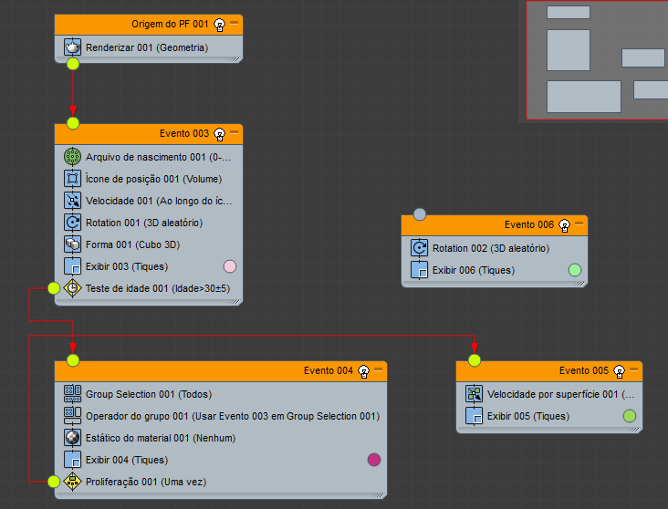 Na rede de Fluxo de partículas mostrada acima, todas as partículas no Evento 01 que são aprovadas no Teste de idade são direcionadas para o Evento 02, mas somente aquelas que foram selecionadas pelo operador Seleção de grupo no Evento 02 usarão os operadores no Evento de rotação. Em seguida, todas as partículas que fluíram para o Evento 02 (incluindo as partículas selecionadas com o operador Seleção de grupo e as não selecionadas) são direcionadas ao Evento 03 por meio do Teste de geração.