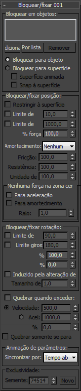 Se o objeto ou superfície for animado, as partículas podem precisar mover-se rapidamente para acompanhar a animação do ponto de bloqueio e ficar dentro da distância do Limite de deslocamento. Se Limite de deslocamento estiver ativada e partículas não é puderem acompanhar o movimento do ponto de bloqueio, as partículas estarão limitadas dentro da distância do Limite de deslocamento para o ponto de bloqueio (para o Limite de deslocamento), mesmo se Força for menos do que 100%. Além disso, se a Velocidade limite estiver ativada, as partículas podem exceder o limite de velocidade para manter o deslocamento especificado. Em outras palavras, o parâmetro Limite de deslocamento, quando ativado, substitui o parâmetro do Limite de velocidade.