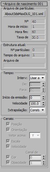 Contém um botão que mostra o nome do arquivo da nuvem de pontos XML que define os parâmetros de nascimento das partículas; para escolher um arquivo diferente, clique no botão e utilize a caixa de diálogo do arquivo que abre. Este grupo também contém dados básicos somente leitura sobre o arquivo de partículas, incluindo o número total de quadros, o tempo de início e fim, além da taxa de quadros da animação.