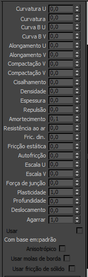 Salve os parâmetros de Propriedades do tecido em um arquivo a ser carregado em um momento posterior. Por padrão, os arquivos de predefinição de tecido são salvos na pasta \tecido no diretório de instalação do 3ds Max.