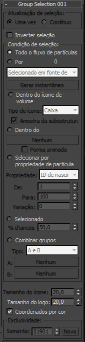 Depois que o instantâneo é gerado, você pode alterar a seleção de partícula do quadro ou subobjeto sem afetar a seleção neste operador de Seleção do grupo. Lembre-se que a seleção atua com base nas IDs da partícula. Portanto, se o número de partículas na viewport e a renderização são diferentes, o efeito global pode ser drasticamente diferente. Para utilizar este tipo de seleção de forma eficaz, sincronize o percentual de partículas na viewport e no renderizador.